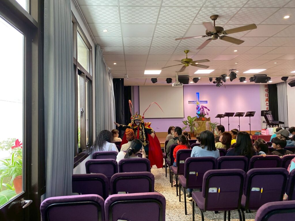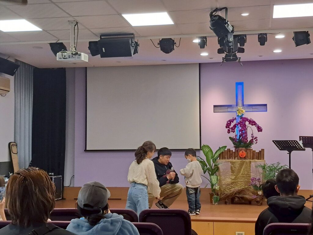 上午11點,二樓主堂舉行另一個活動高潮,許多參與市集的來賓也受邀進入主堂參與福音環節。活動一開始由神話樂團帶領兩首輕快詩歌,帶動現場氣氛;接著小偉帶來精彩的川劇變臉表演,並與現場觀眾有趣互動,引起陣陣驚呼與笑聲。隨後由庭宜分享她的生命故事。她提到,自己受洗十三年,一直努力跟隨信仰,但過去三年卻經歷離婚與孩子監護權訴訟的風浪,一邊照顧三個孩子,一邊承受生活與經濟壓力,內心常常感到混亂與沒有平安。去年底她又失去了最親近的姐姐,一度陷入低潮,甚至沒有力氣參加小組聚會。然而在這段艱難的日子裡,她逐漸看見神透過許多弟兄姊妹的陪伴與鼓勵,像天使般守護在她身邊。直到今年年初,她在一次小組禱告中只提出一個簡單的代禱:希望重新建立讀經的習慣。之後在屬靈同伴的陪伴下,她重新回到神的話語,也想起耶穌所說「馬利亞已經選擇那上好的福分」。她分享,自己過去一直努力抓住家庭、經濟與未來的問題,卻忽略了最重要的一件事,就是先來到主面前。因此她決定重新選擇那「上好的福分」,讓生命重新以神為中心。慢慢地,她的家庭也開始有新的改變,孩子們開始一起讀聖經、一起禱告,生活中學習感謝神。她感性地說,當一個家重新把神放在中心,神就會一步一步重新建立這個家。
