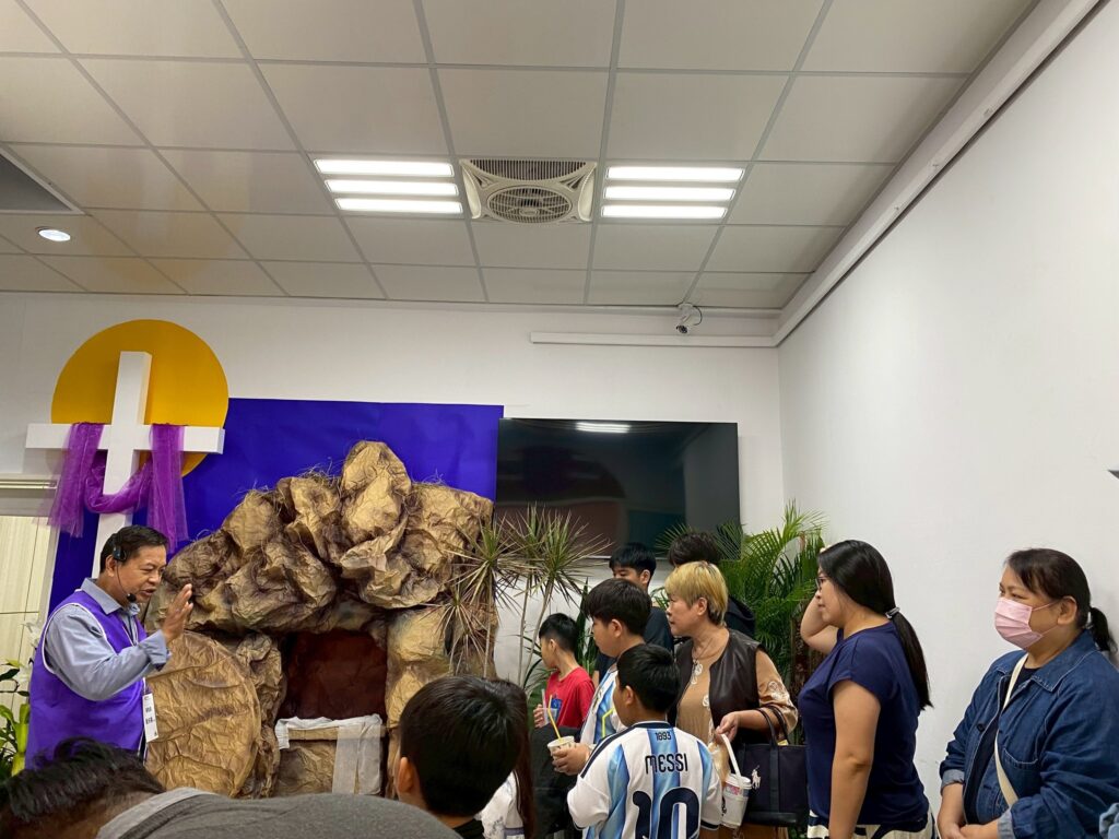 今年市集的一大亮點,是教會大廳特別設置的「空墳墓」裝置藝術。這個由天賜設計的藝術作品栩栩如生,重現復活節的重要象徵——空墳墓,傳達「耶穌已經復活」的核心信息。活動當天也由天賜親自為來賓導覽,帶領大家了解復活節的意義,只要參與導覽就能獲得抽獎券與復活蛋,吸引不少民眾駐足聆聽,也讓整個市集多了一層信仰與藝術結合的特色。