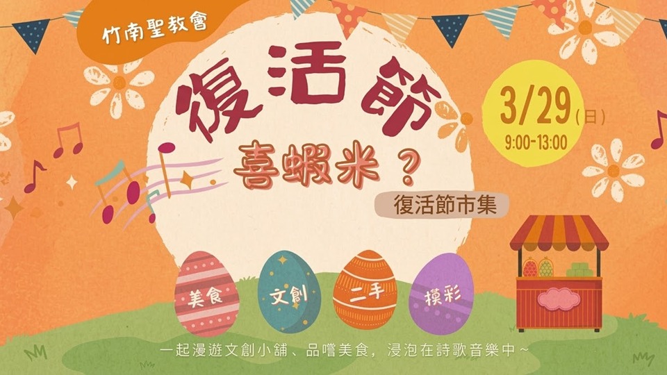 3月29日主日,教會在喜樂與期待中舉行主日聚會,並於聚會後展開年度福音活動「復活節喜蝦米市集」。去年教會首次在獅子親子公園舉辦市集,今年則移師回到教會園區,希望讓更多鄰舍朋友能走進教會,在輕鬆自在的氛圍中認識福音、感受教會文化。上午9點先舉行主日崇拜,10點市集正式啟動,庭院與副堂陸續擺設攤位,輕快的音樂在庭院播放,吸引許多民眾駐足。入口處設置拍照打卡區,來賓拍照打卡即可獲得飲料;地下室則安排兒童福音活動,讓家長能安心參與市集與交流。